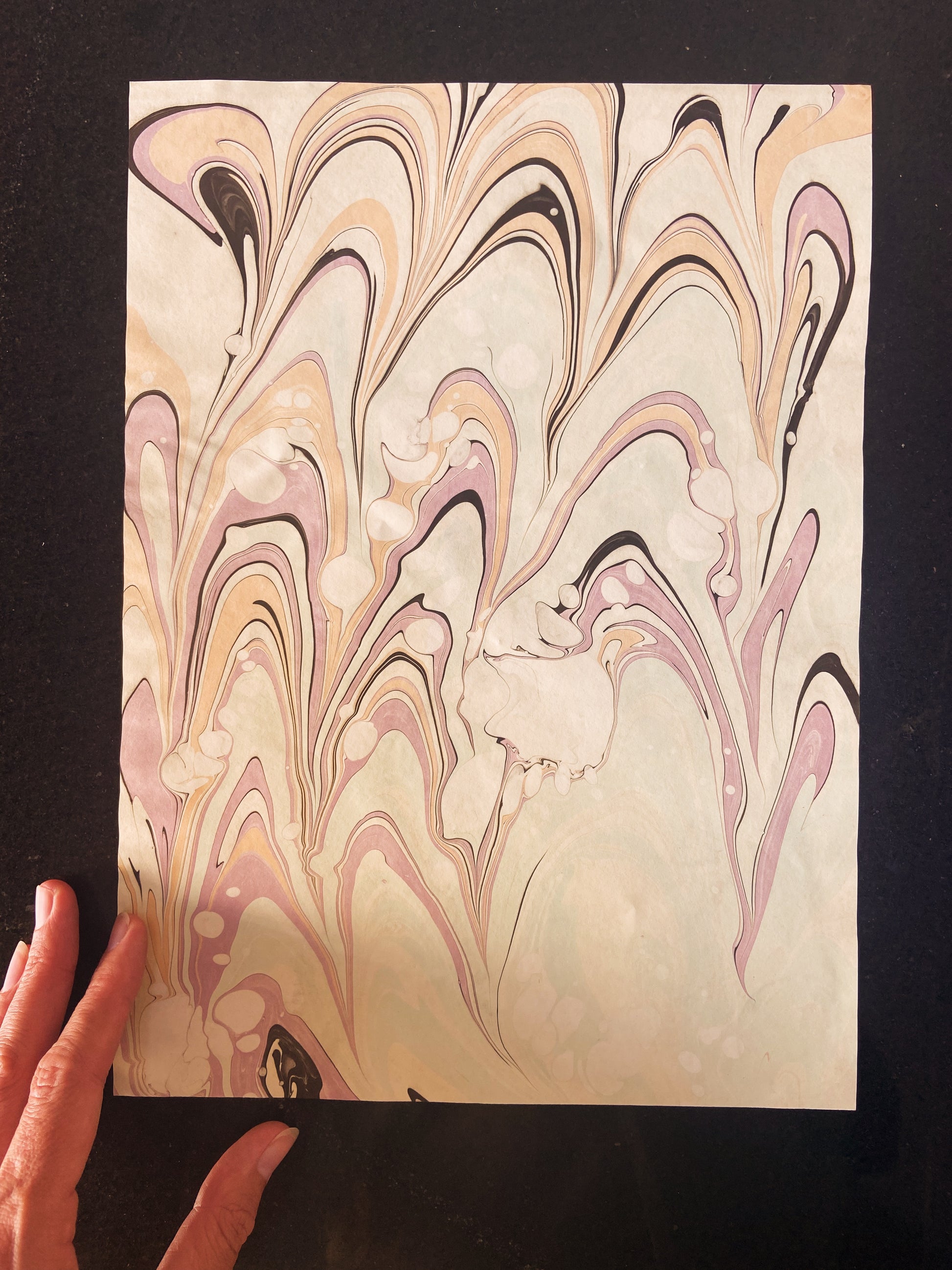 Gouache paint on a lightweight professional ebru pulp paper. (Approx 80 grams)